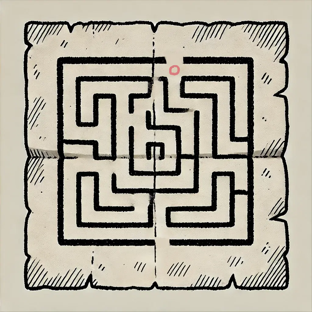 As you venture further into the Guardian’s keep, the fog thickens, and you find yourself standing before a massive structure made entirely of ice — the Rotating Labyrinth. People speak of this labyrinth as ever-shifting, a living maze that defends the path to the Ember of Warmth. Each step you take causes the walls to twist and the corridors to rotate, disorienting even the bravest of souls. To prepare for the challenge, you begin drawing the maze on a piece of paper, hoping to better navigate its twists and turns.